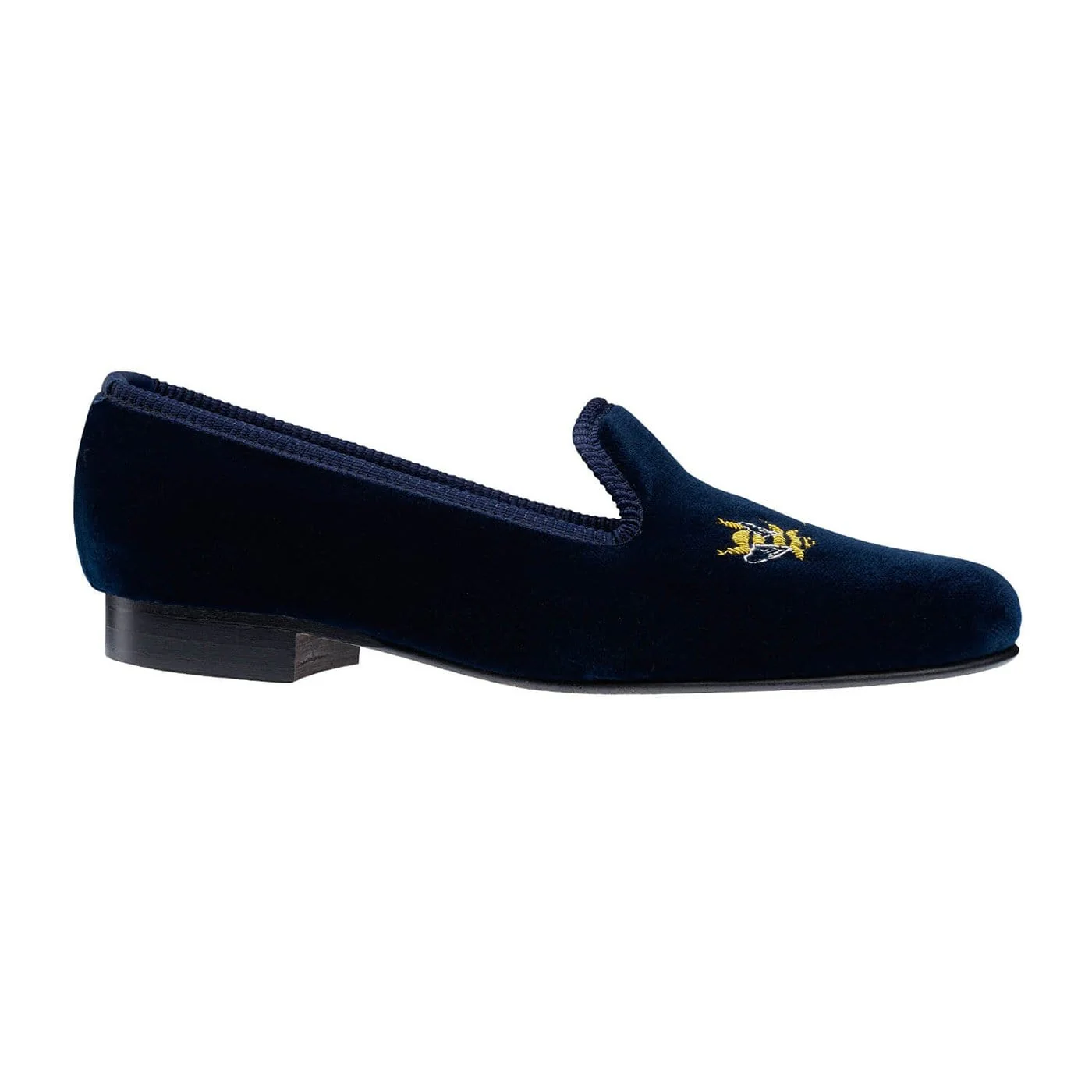 Bees, a house slipper with embroidery design made from soft navy velvet, with satin quilted linings and hard leather soles. From the Women's Collection.